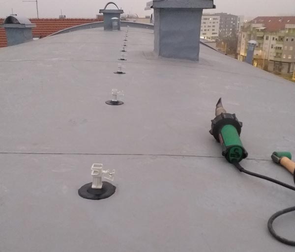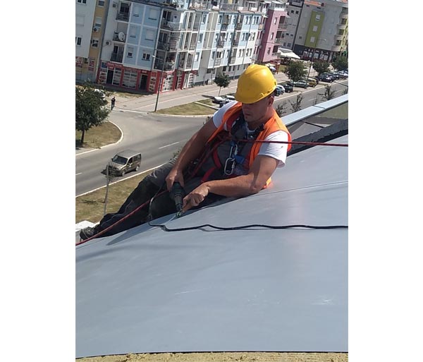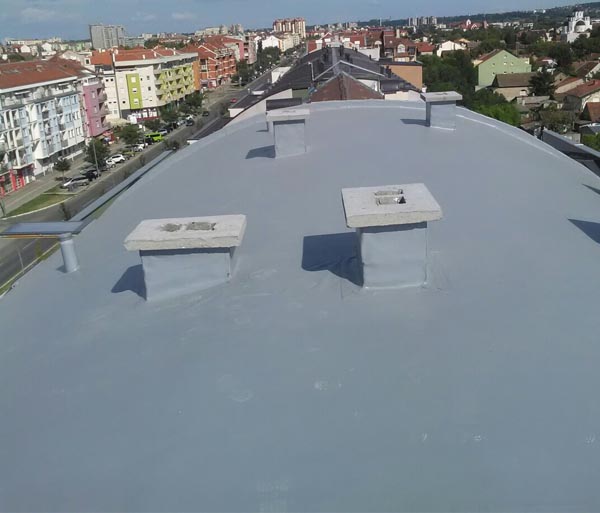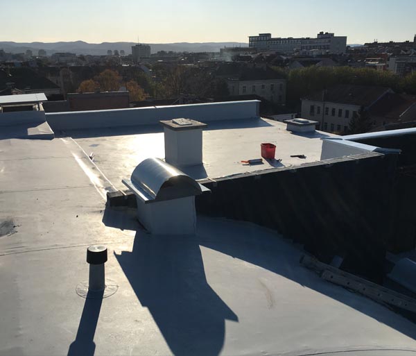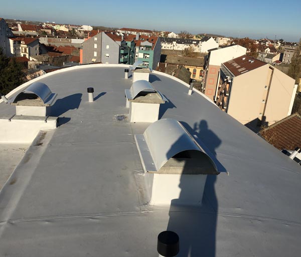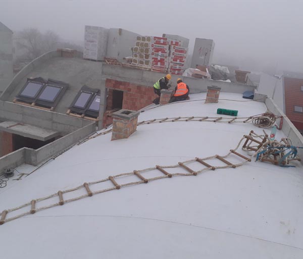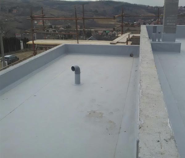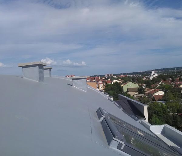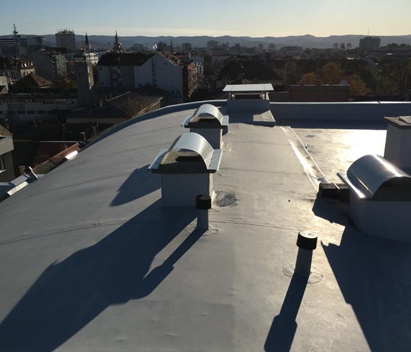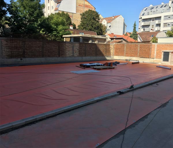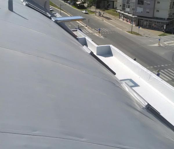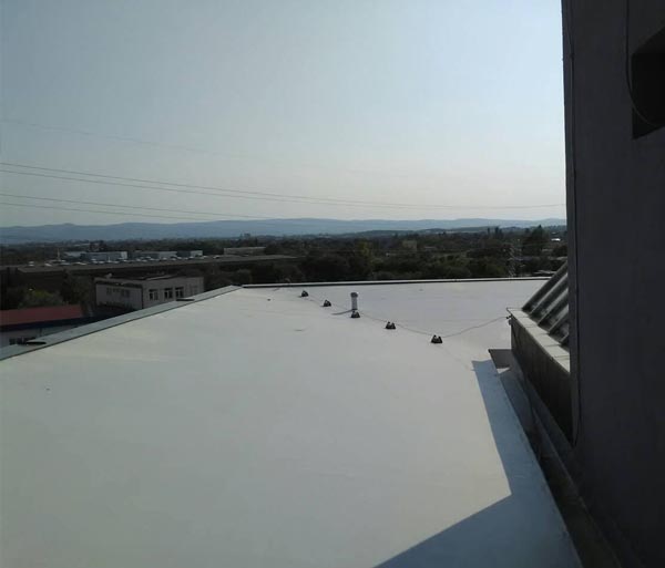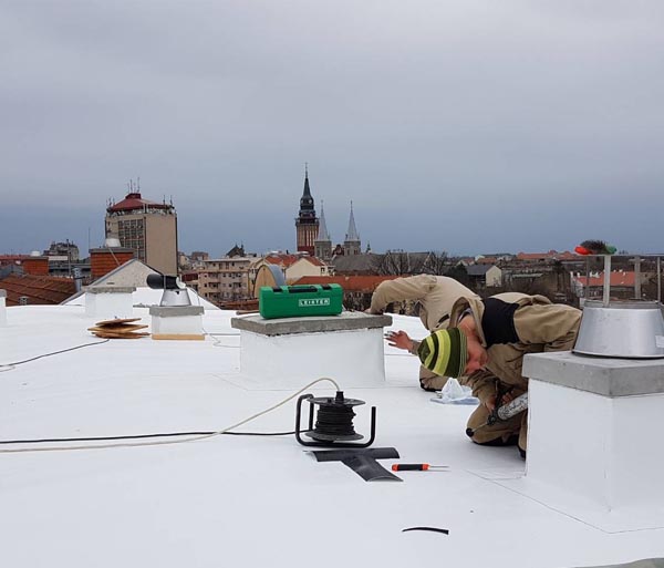 Hidroizolacija ravnih krovova poslovnih objekata: bilo da je krovna ploča izvedena kao monolitna AB tavanica ili od TR lima, kao završni sloj neizostavna je ugradnja sintetičkih membrana: PVC, FPO, TPO, EPDM itd… kontaktirajte nas kako bismo dali idealno rešenje za Vaš poslovni objekat.